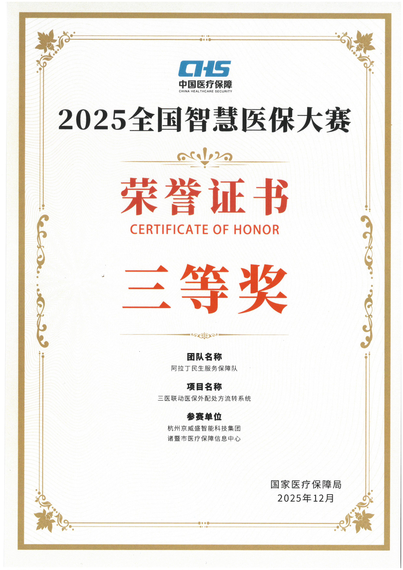 京威盛智能是国家医保局医保新支付(首批)资质的专精特新企业,浙江省AAA“重合同守信用”企业,并多次荣获国家医保局《智慧医保解决方案》全国比赛大奖。